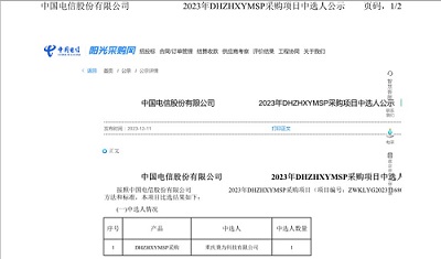 ? ? ? ? ? ? ? ? ? ? ? ? ? 據(jù)中國(guó)電信“陽(yáng)光采購(gòu)網(wǎng)”2023年12月11日消息,我司顯示產(chǎn)品中標(biāo)(金額351萬(wàn))中國(guó)電信。(營(yíng)銷(xiāo)部供稿)